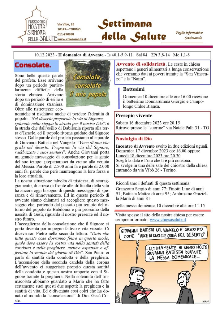 Eccoti il foglio della Settimana della Salute di domenica 10 dicembre 2023.